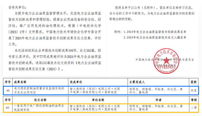 此外,智火柴科技在2024年電力企業(yè)油質(zhì)監(jiān)督技術(shù)創(chuàng)新成果及論-文征集活活動中,以《一套適用于電廠燃機控制油的油質(zhì)在線監(jiān)測系統(tǒng)》為題的成果文章成功入編《電力企業(yè)油質(zhì)監(jiān)督技術(shù)創(chuàng)新成果及論-文集(2024)》,被評選為二等獎?wù)?文、四-星-級成果獎!