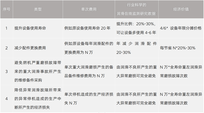 避免燃機嚴(yán)重磨損故障帶來的重大潤滑事故所產(chǎn)生的維修備件采購,降低異常潤滑故障所帶來的異常停機造成的生產(chǎn)中斷所產(chǎn)生的經(jīng)濟損失。
