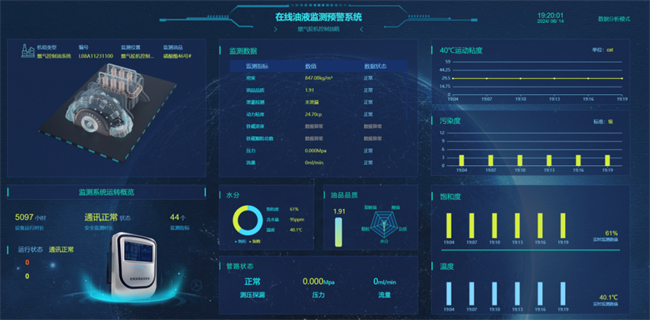 該系統(tǒng)由安裝在現(xiàn)場的監(jiān)測傳感器、數(shù)據(jù)處理及傳輸系統(tǒng)、數(shù)據(jù)分析診斷平臺等組成,具備實時采集油溫、含水量、運動黏度、金屬磨粒、顆粒污染度等質(zhì)量指標(biāo)功能。
