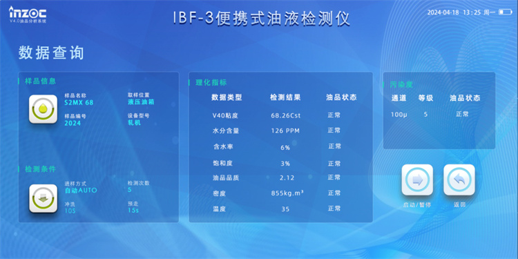 為了進一步驗證在線監測系統的可靠性,我們的技術人員采用了多項檢測方式:一,在嚴格遵循標準取樣操作流程下將樣品送檢至第三方機構進行專 業分析;二,利用IBF系列便攜式油品檢測儀進行現場即時檢測,結果顯示污染度等級為2級。