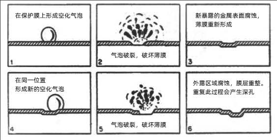 實驗顯示,氣泡快速破裂可產生高達414MPa的沖擊波,足以使多種金屬產生塑性變形。以下是氣蝕的主要發生步驟: